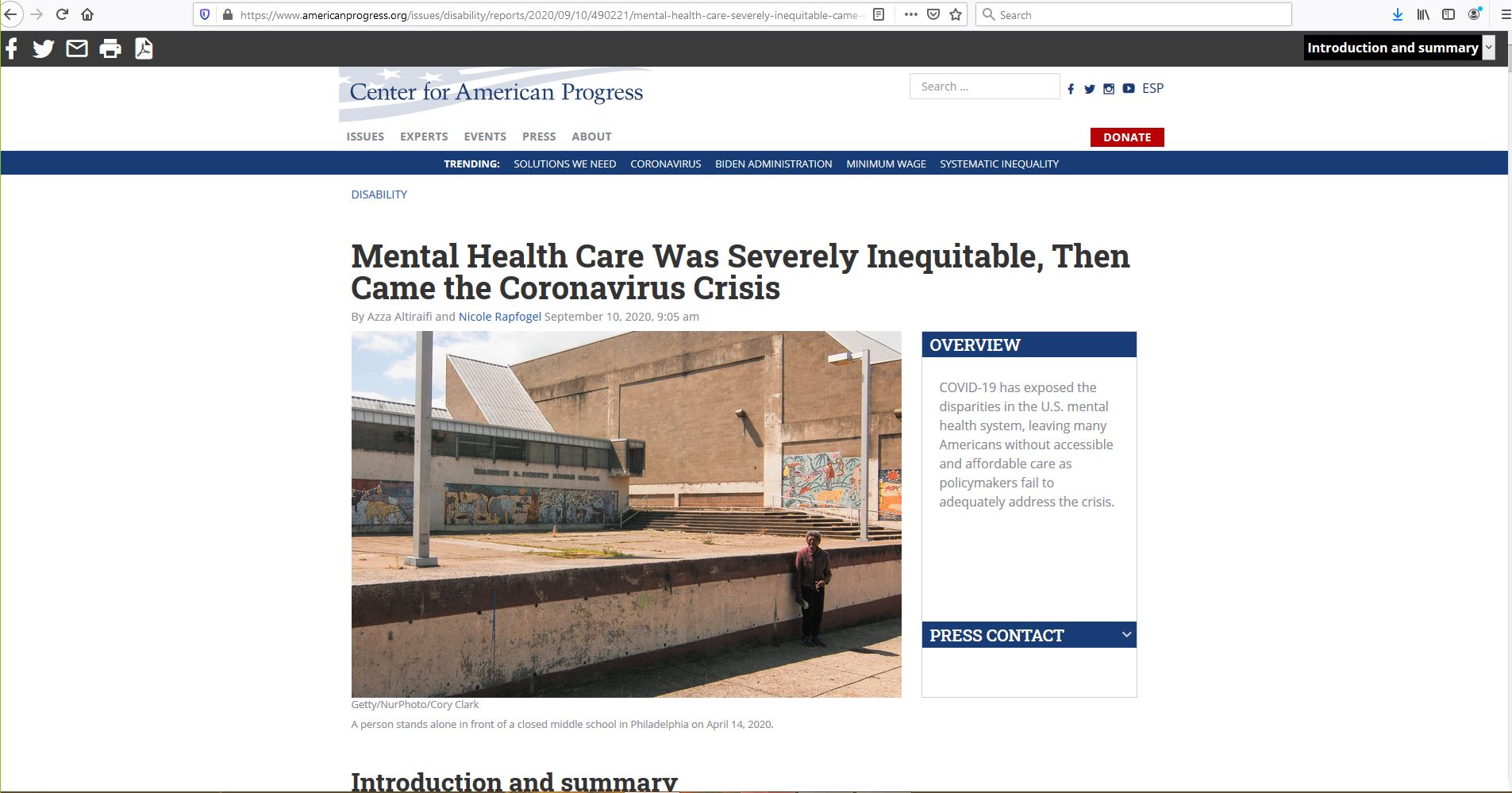 This article describes how the Covid-19 pandemic has compounded the mental health disparity in the United States. As the title suggests, those suffering from mental illness already did not receive equitable treatment; the pandemic has widened this inequality through a variety of issues, chiefly, disruption of service that was already minimal.