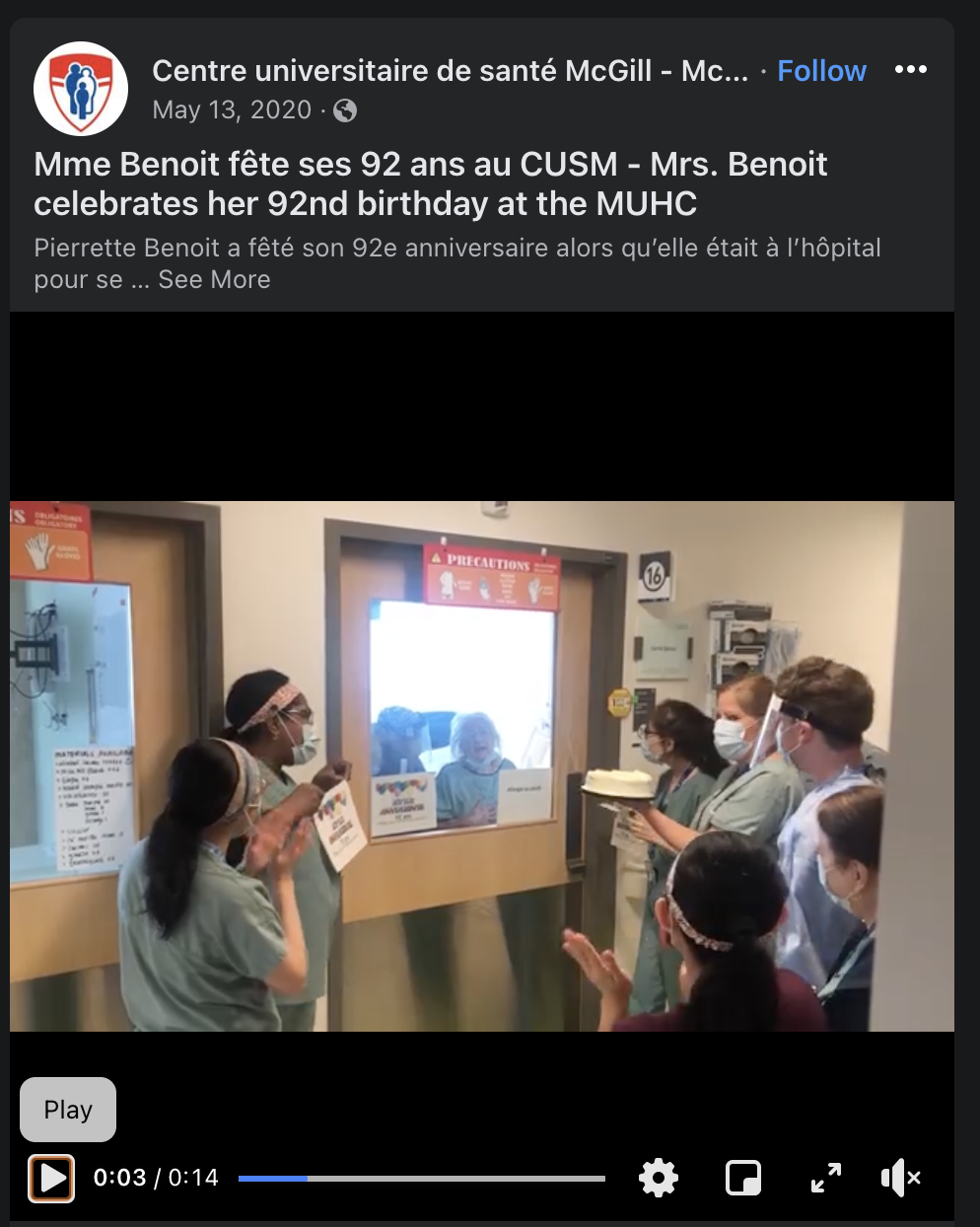 The workers at Centre universitaire de santé McGill celebrate the 92nd birthday of a patient in quarantine.