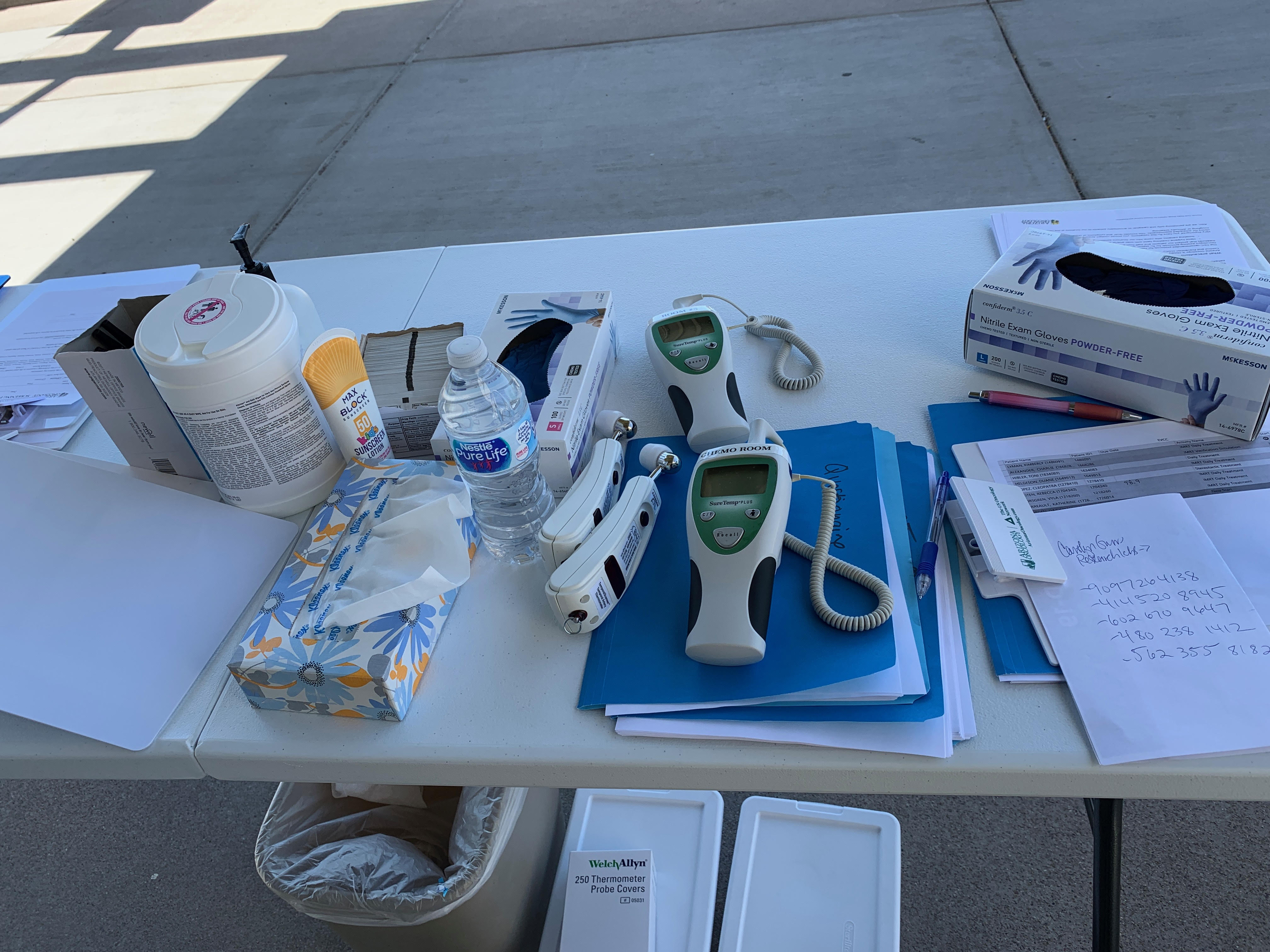 This is the table outside my moms work. She is a manager at a special practice medical facility called Arizona Oncology. Her staff check everyone that walks into the building, making sure they don't have a fever and wear their mask properly. There are arguments and disagreements at this desk everyday. Either patients don't believe the virus is real, refuse to wear a mask or flat out want to be an issue. They've recently hired a security guard to help handle those causing issues.