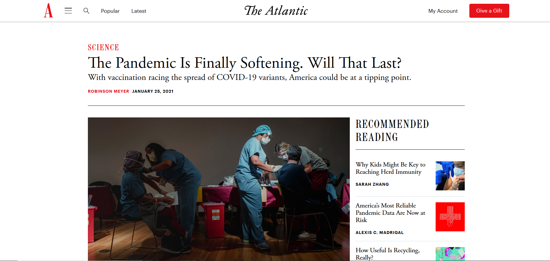 This Atlantic Monthly article, written by Robinson Meyer, details the race to vaccinate millions of Americans in the face of loosening mitigation efforts, new COVID-19 strains, and supply bottlenecks. According to Meyer, with the advent of several COVID-19 vaccines, some states and municipal governments across the country have loosened their quarantine restrictions in the belief that vaccination and lower death rates make lockdowns unnecessary. This is not true, and this loosening of restrictions may precipitate further surges in COVID-19 cases, especially as new strains from the UK and South Africa become endemic. Fewer vaccine doses will be delivered by Pfizer, due to an agreement signed by the Trump administration.