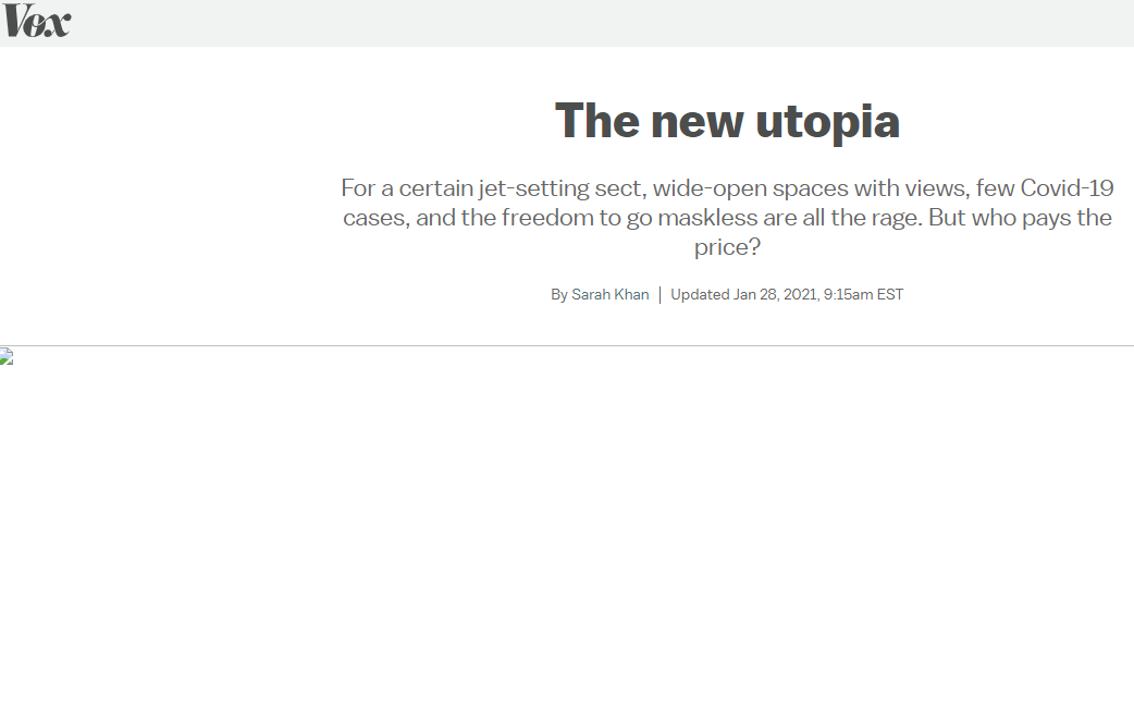 This Vox article by Sarah Khan is about the phenomenon of "pandemic tourism" to tropical places such as Tulum, Mexico; and Honolulu, Hawaii. According to Khan, these tourists, usually Western, seek to escape quarantine restrictions in their home countries and risk the health of foreigners by bringing COVID-19 with them.