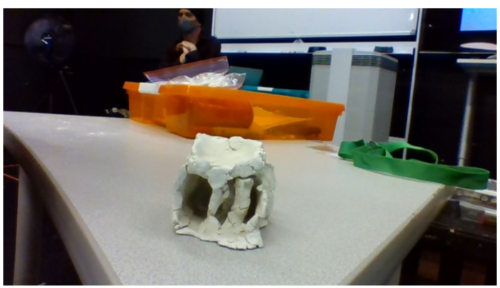 I made this clay sculpture This represents my house the people stuck in the cage is me and my family I have been stuck at my house and cant go out but I get to be with my family all day because we are all stuck together