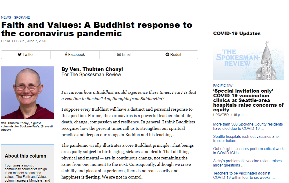This article speaks to a specifically Buddhist response to the pandemic. The monk in this article offers ways to deal with the pandemic from a Buddhist perspective. While Buddhism is a specific worldview, the advice given in this article can be used by all people. Thinking about questions concerning life and death should be confronted and asked rather than cowering away. From the response given, the pandemic should teach people to love and care for all, even in the midst of a deadly virus.