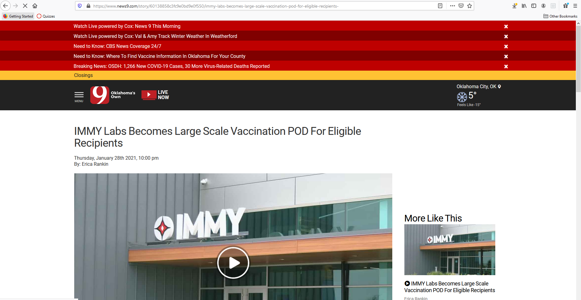 IMMY Labs is a local company in my area that had previously offered free COVID testing to Oklahomans. Starting last week IMMY Labs created a POD at the Embassy Suites in Norman, Oklahoma. This offered senior citizens and healthcare workers the opportunity to receive the Pfizer vaccine and automatically sign up for the follow up vaccination. The POD is processing approximately 1200 people a day. Before many people in my area were driving up to 150 or more miles, roundtrip, to try to get vaccines. This has greatly improved availability for the elderly in my area.