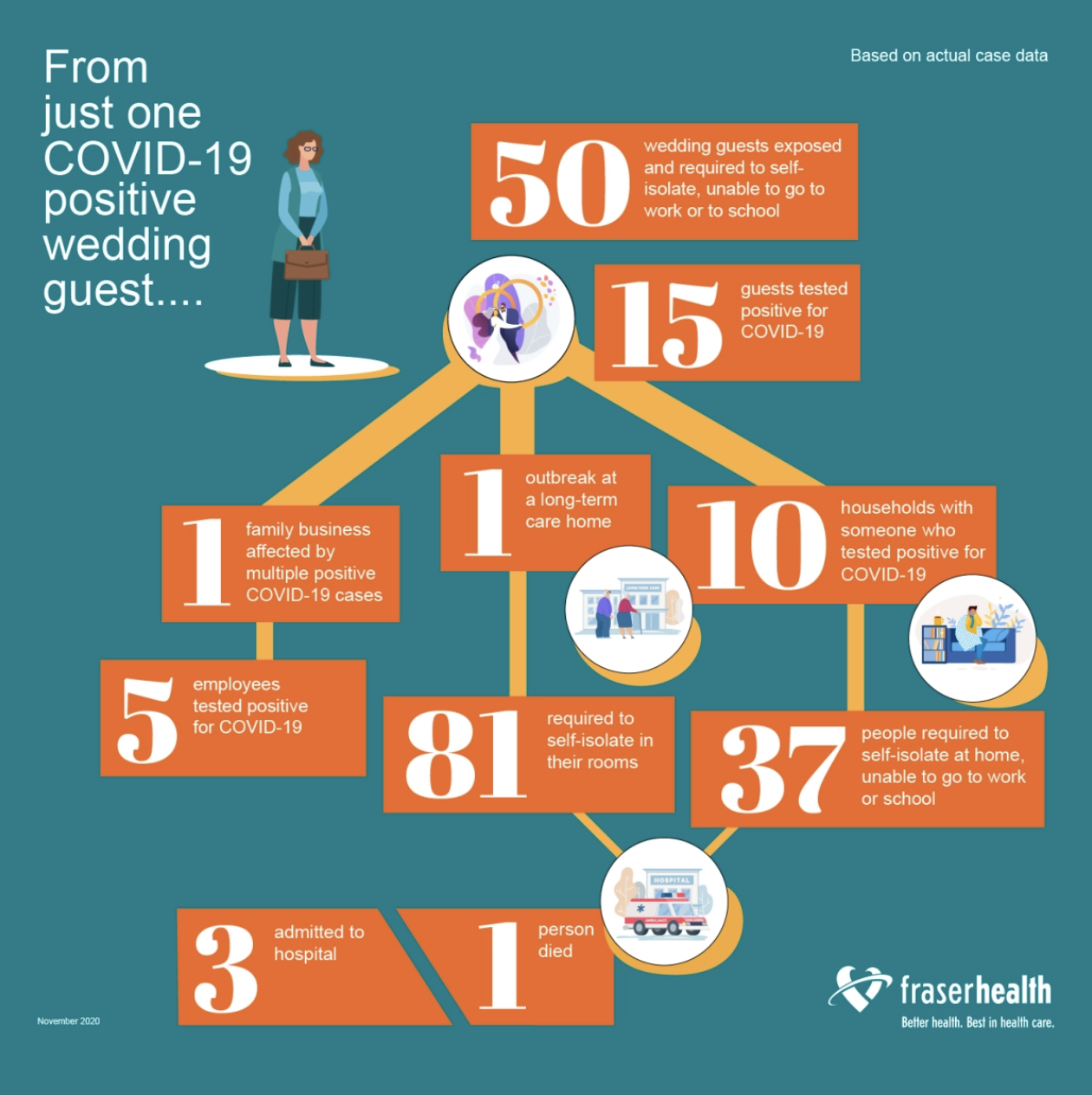 What started with one positive wedding guest, led to 50 infected guests, 10 infected households, and a deadly outbreak in a long-term care home which resulted in 81 cases. In total, this large outbreak triggered three hospitalizations and one COVID-19 death.