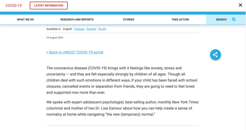 The website provides a list containing 6 ways in which a parent can support their child through the pandemic. Reading through the many stories under that "children" collection I have come to notice that many of the posts are by children who face difficulty with daily life during the pandemic, whether that be through school, unable to physically socialize, or the fact that their childhoods are passing while sitting at home. This website gives an inside on how parents can help their children as well as gives reasons on to why these can help positively support their children.
