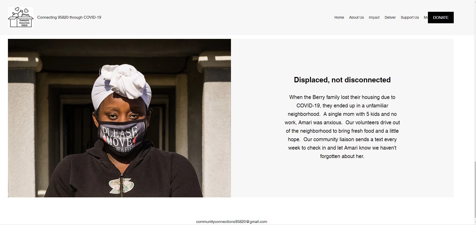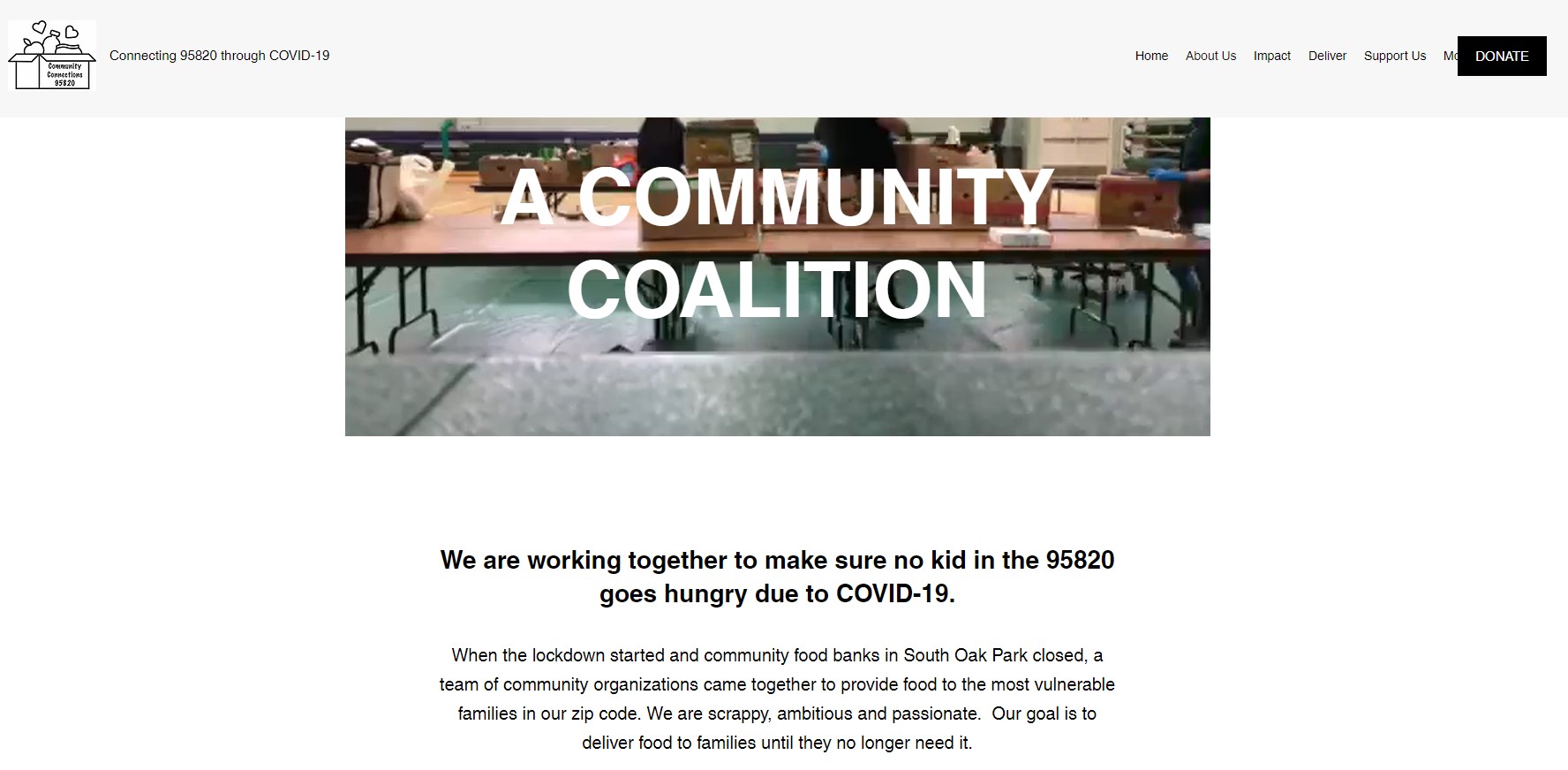This website is a rallying point for Community Connections 95820, a community organization that works to provide food to families in need in the South Oak Park neighborhood of Sacramento, California. This organization is picking up where food banks are leaving off as many of the food banks in this neighborhood have closed due to the pandemic, and families have been lacking food for a variety of reasons. This highlights food scarcity issues during the pandemic and efforts of community members to make sure their neighbors are still able to get food. The “About Us” page says Community Connections was inspired by a project called Invisible Hands, in New York City. Community Connections highlights their commitment to safety, dignity, and anonymity for the families, sponsors, and volunteers.