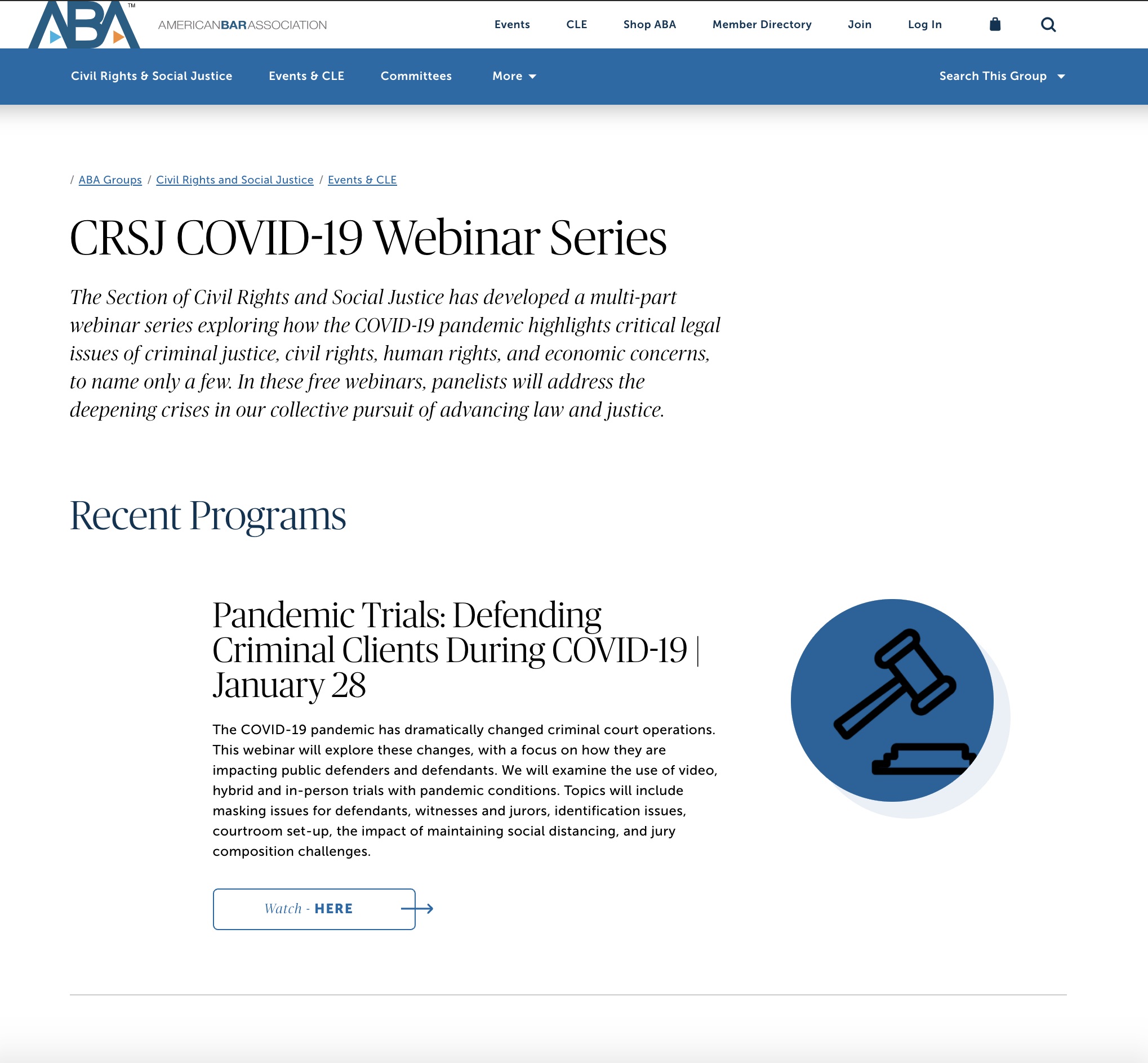 The American Bar Association is hosting a series of webinars on various social Justice issues and how they relate to Covid-19. Webinars include: Pandemic Trials: Defending Criminal Clients During COVID-19. New Jersey COVID-19 Jail Release Agreement. Expanding Pretrial Release in the Age of COVID-19. Implications of the COVID-19 Pandemic on African Americans and Communities of Color. COVID-19 and the Compassionate Release of the Elderly, Infirm or High Risk. Reentry Planning for COVID-19 Releases. Issues Affecting Native American Communities During the COVID-19 Crisis. COVID-19 and Child Welfare Cases. Coronavirus: Homeless Community Adverse Impact from Eviction & Lack of Safe Housing. Public Health Measures In Response to COVID-19 (CLE), Lessons from Past Disasters: Criminal Justice Response to COVID-19. COVID-19: Threats to Democracy and to Public Safety Through the Lens of the Asian American Experience. Religious Freedom Implications of the COVID-19 Pandemic. Disability Discrimination in the Rationing of Life Saving COVID Treatment: Who Gets Left Behind? This is not the full list.