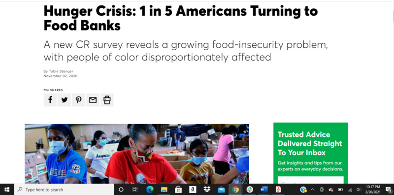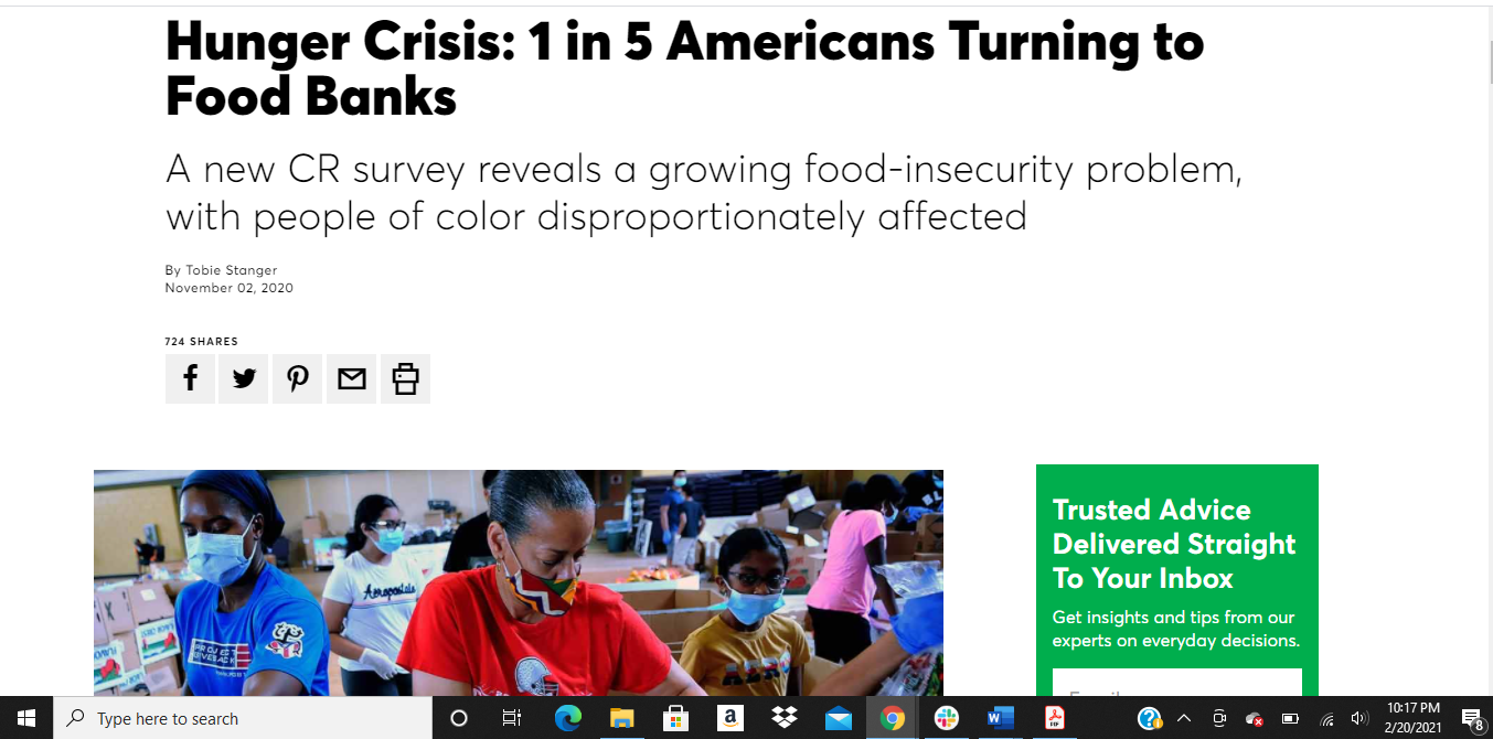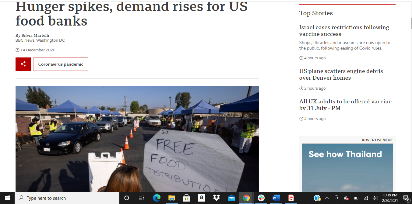 Hunger has been a world-wide problem for a long time, and is something I would like to see ended in my life time. However, during this pandemic, when many more people began facing economic hardships, we see different outcomes. Some people are trying to make changes and help more vulnerable people, like some of the stories you can find on foodbanknews.org. Unfortunately, there are still many people facing the fact that they do not know when their next meal will come from. It isn’t a food problem, it is a society problem.