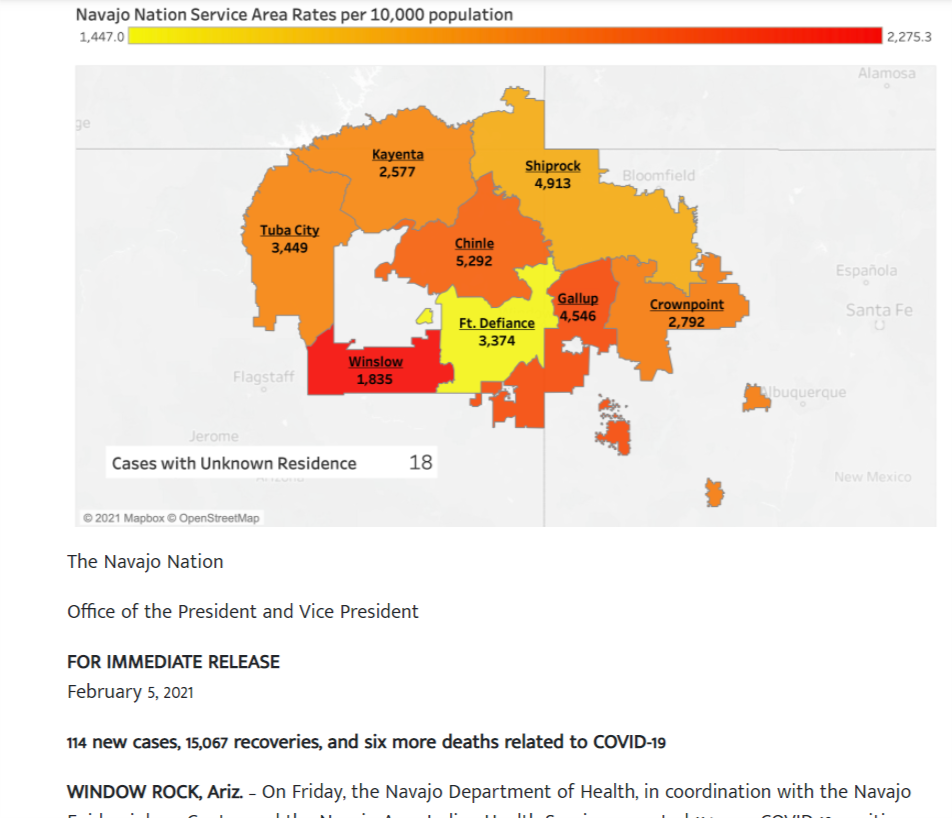The Navajo Department Health shared its latest data regarding positive cases, deaths, and recoveries. It reminds its members to continue avoiding large gatherings including the upcoming Super Bowl in order to prevent an upsurge in cases. It also gives drive-thru vaccination locations for its Navajo communities and thanks its healthcare workers, working long hours vaccinating tribal members. These stories are important archival items that highlight what measures the Navajo Nation are using to protect its people.