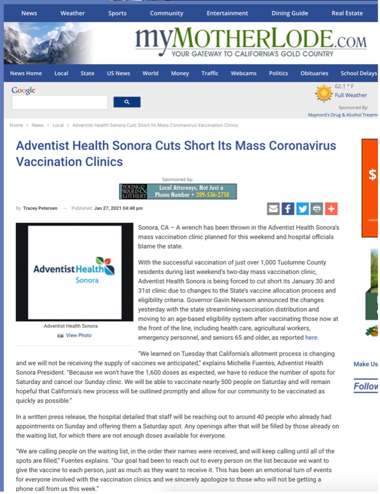 Adventist Health Sonora Cuts Short Its Mass Coronavirus Vaccination Clinics