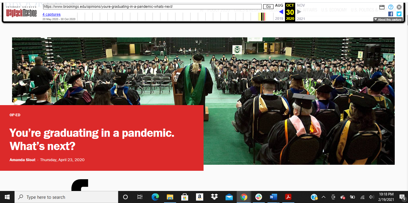 This is an article talking about what someone should do after graduating from college in a pandemic. I felt this was an important article to include in this collection because not only is it important to know what the graduations were like but it is also important to know what someone did after graduation. Jobs were very hard to come by and unemployment was at an all time high during these times and after graduation usually someone goes and gets a job with that degree but with businesses closing it is hard to find one. This article gives tips and tricks on how to obtain a job during this pandemic as well. This article explains how any job is a good job in a pandemic which is very true. The article also explains that it is normal to feel discouraged at this time and to not give up. The pandemic will end and jobs will come back.