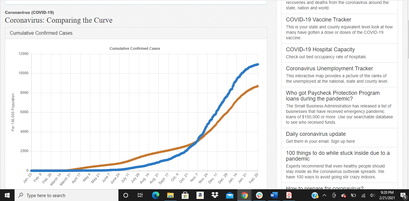 These graphs illustrate the to-date experience of COVID-19 infections and known positivity rates for Eddy County (NM), the State of New Mexico, and the United States. This data demonstrates dichotomies in the experiences of that county, the state, and the nation from the beginning of 2020 through February 6, 2021. Such data provides context to discussions and debate on public behavior, public health policy, and executive actions taken within the State and the County. This is important to me because many of my close and extended family members still reside in and around Eddy County, and the infection rates and restrictions they have endured has been especially tough on them and their community.