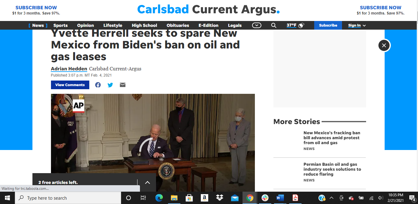 This article from Carlsbad Current Argus reporter Adrian Hedden explains NM District 2 Congressional Representative Harrell's efforts to preserve the oil-and-gas driven economy in New Mexico. The oil and gas lease referenced here applies to federal lands, and the ban of new lease issuance impacts existing operations. Much of southeastern New Mexico is federally owned, while nearby Texas is predominantly private land. The effect of this ban, if successful, would merely drive operations a few miles across the state line without largely impacting production from within the Permian Basin; it will, however, destroy the New Mexico economy, approximately 40% of which depends on oil and gas operations within the state. This article and topic are important to me because of my familial ties to New Mexico, but also because it demonstrates the unintended and myopic objectives set forth in this particular executive order. The economic impact of this ban would further exacerbate community and statewide problems related to COVID-19 as homeless has recently spiked in that region, and the disappearing tax base has further inhibited county and state programs and operations.