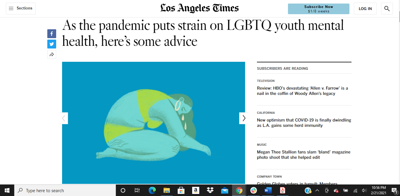 A news article discussing the mental struggles of the LGBTQ+ youth, and how quarantine is negatively affecting their health, as well as some helpful tips.