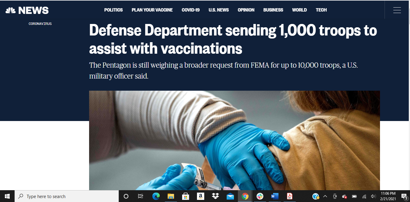 The article discusses the federal government's aid in California, where they would be sending troops to assist with vaccinations, as well as open two federally run vaccination sites in order to ensure that anyone wanting a COVID-19 vaccine would be able to get one.