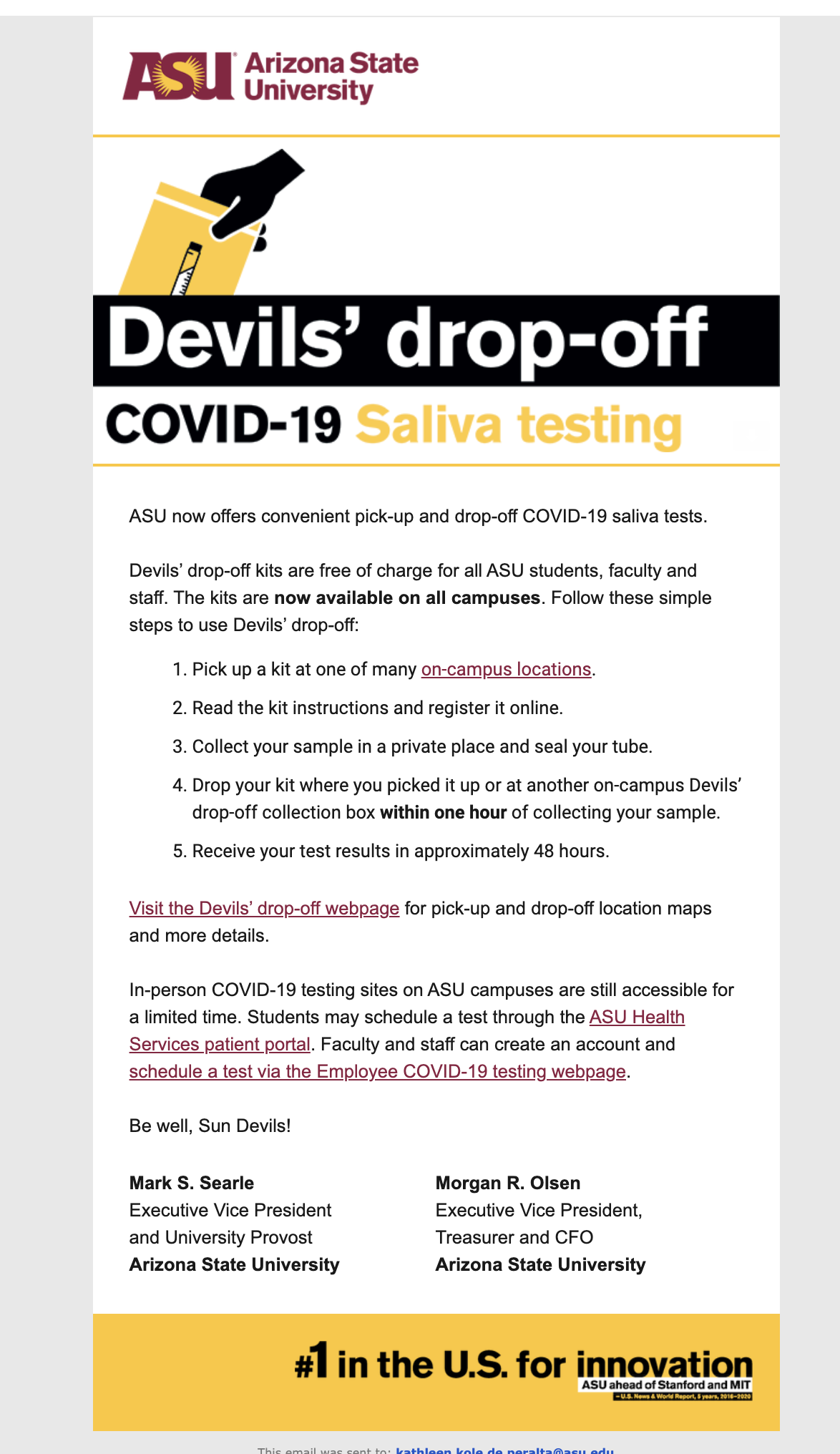 ASU just announced a drop-off COVID-19 saliva testing program. Testing at ASU and in the community, thanks to the ASU Biodesign Institute, has been more accessible and efficient compared to other states. Now, ASU is letting people pick up kits, fill them, and drop them off at a collection box. Results are speedy, returned within about 48 hours. It's reassuring to work in an enivornment that takes the public health crisis seriously and is actively taking measures to reduce risk and exposure.