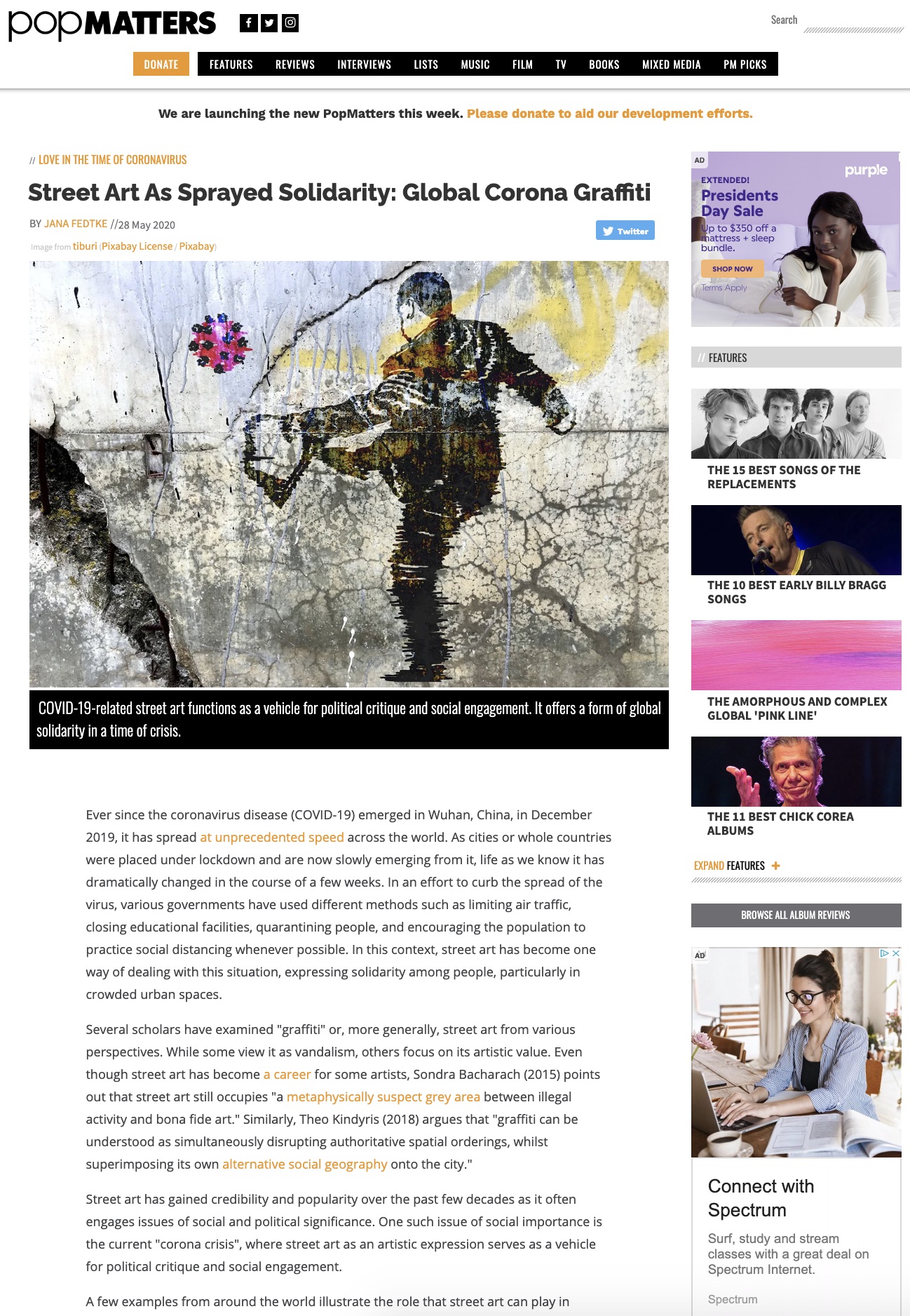 This article, written by Jana Fedtke for PopMatters, describes instances of worldwide street art as political critique and social engagement during the pandemic. Examples of street art shown include stencil work. The author explores the ways in which street art relay information about how government agencies have handled spreading information and health care and in turn, how street artists depict social engagement with pandemic procedures.