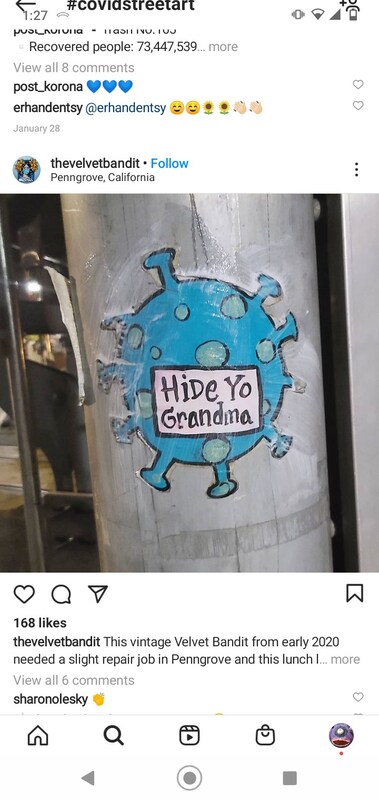 This post is by the artist Velvet Bandit of their street art pasted on a pole. The work is a cartoon image of the virus with a text box reading, "Hide Yo Grandma."