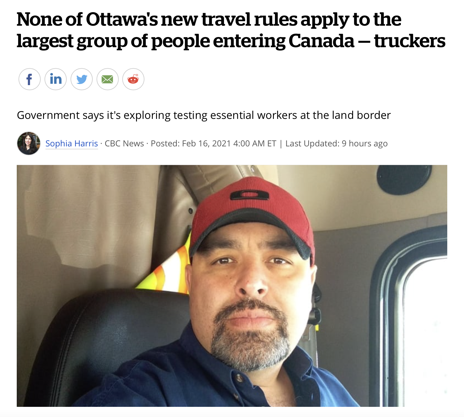 Truckers are not being tested or facing restrictions like other cross-border travelers. This has led to some push back as they likely see more interactions with others than other travelers, including non-essential travel such as recreation. There are talks to either require quarantine and possibility to prioritize truckers for the Covid-19 vaccine.