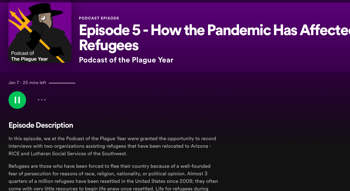In this episode, we at the Podcast of the Plague Year were granted the opportunity to record interviews with two organizations assisting refugees that have been relocated to Arizona- RICE and Lutheran Social Services of the Southwest.