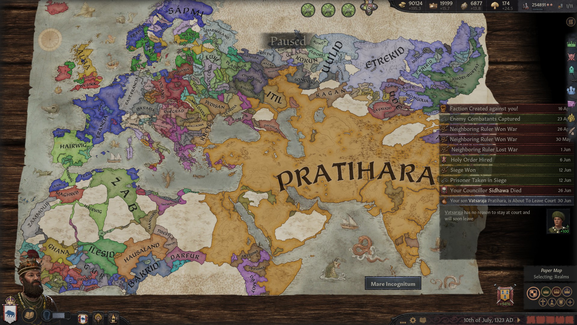This was one of my earlier games, after I was more familiar with how the game differed from CK2. Starting as the Raja of the real-life Northern Indian dynasty of the Imperial Gurjara-Pratihara in 867 CE, through many generations of rulers I managed to consolidate the entire subcontinent through diplomacy, intrigue, and warfare. Around 1000 CE one of my rulers who had a more intellectual education rather than the usual military one, consolidated all imperially sanctioned Hindu beliefs into the Charvaka school, a real-life ancient Hindu belief based on materialism and empiricism. As this new consolidated Hinduism united the subcontinent at a more local level, regional governors along the Indus River took advantage of political fragmentation around the Indian Ocean and pushed west, taking over not just Persia and Central Asia but also establishing Hindu-Somali outposts in Africa and Yemen. By the 1300s the empire spread from Burma in the east all the way to modern day Libya and Greece, with Rome itself falling to a Pratihara expedition. Peace was maintained within the empire's vassals by a robust series of alliances, as well as the use of the "dread" mechanic to scare any more unruly subjects into submission via planned executions and threats. The most serious threats the Pratihara Empire faced was a series of crusades launched from Western Europe, and the Mongol Conquests which were ended by assassinating a few generations of Mongol Khans leading to political infighting and collapse.