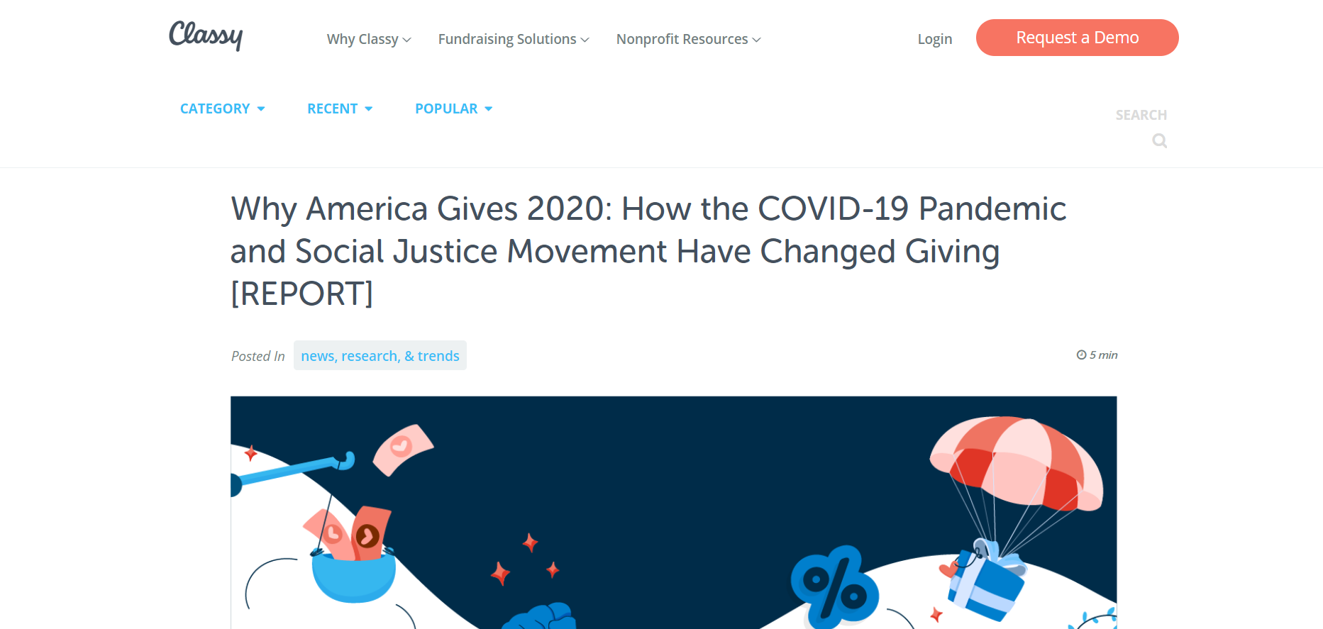 From the article: In previous years, Classy’s Why America Gives report has focused on consumer giving trends, what motivates donors to give, and their plans for Giving Tuesday and year-end giving. In our third-annual edition of Why America Gives, the 2020 report measures these year-over-year changes in giving sentiments and behaviors; in addition, it also analyzes how current events—specifically the COVID-19 pandemic and the social justice movement—have altered giving trends.