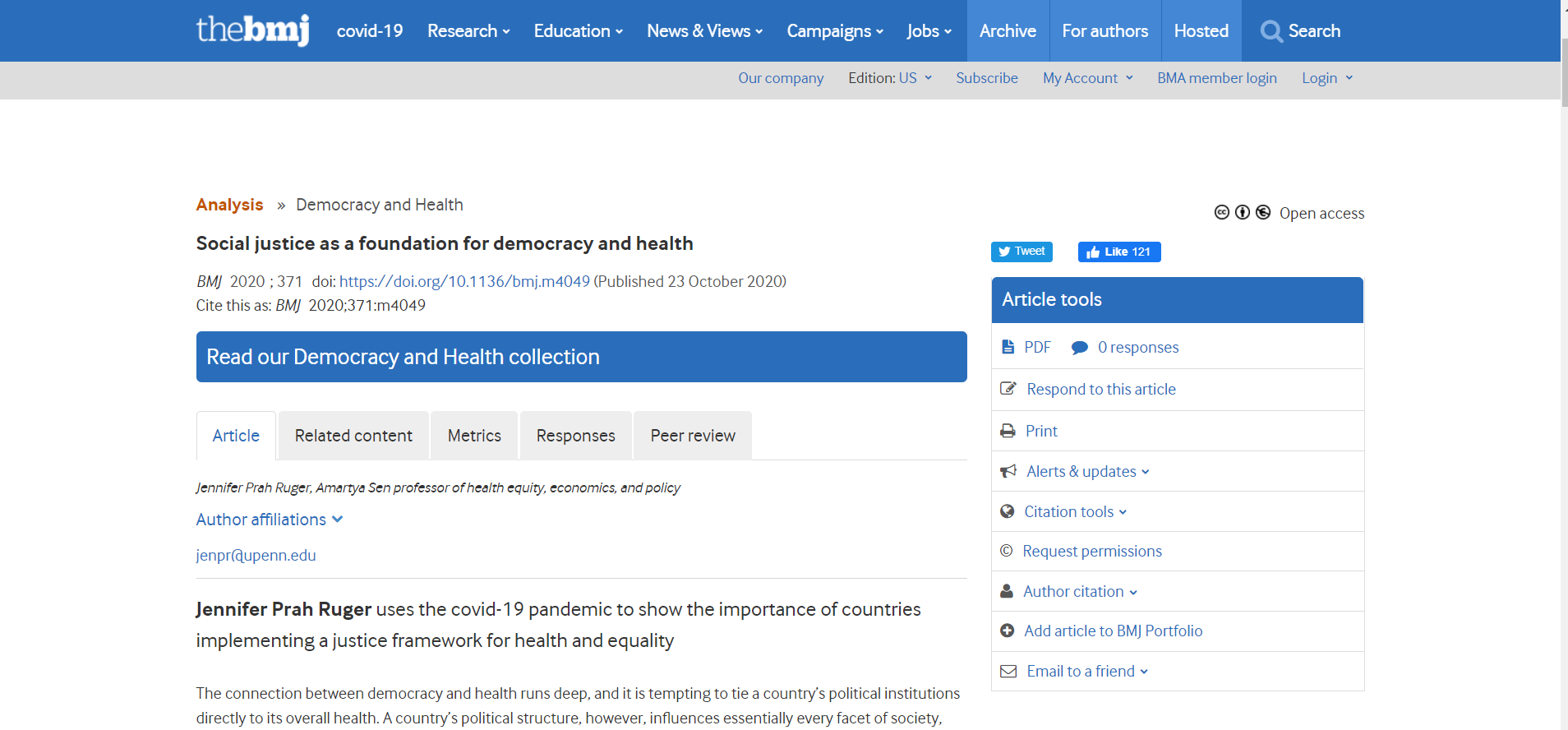 From article: Jennifer Prah Ruger uses the covid-19 pandemic to show the importance of countries implementing a justice framework for health and equality.