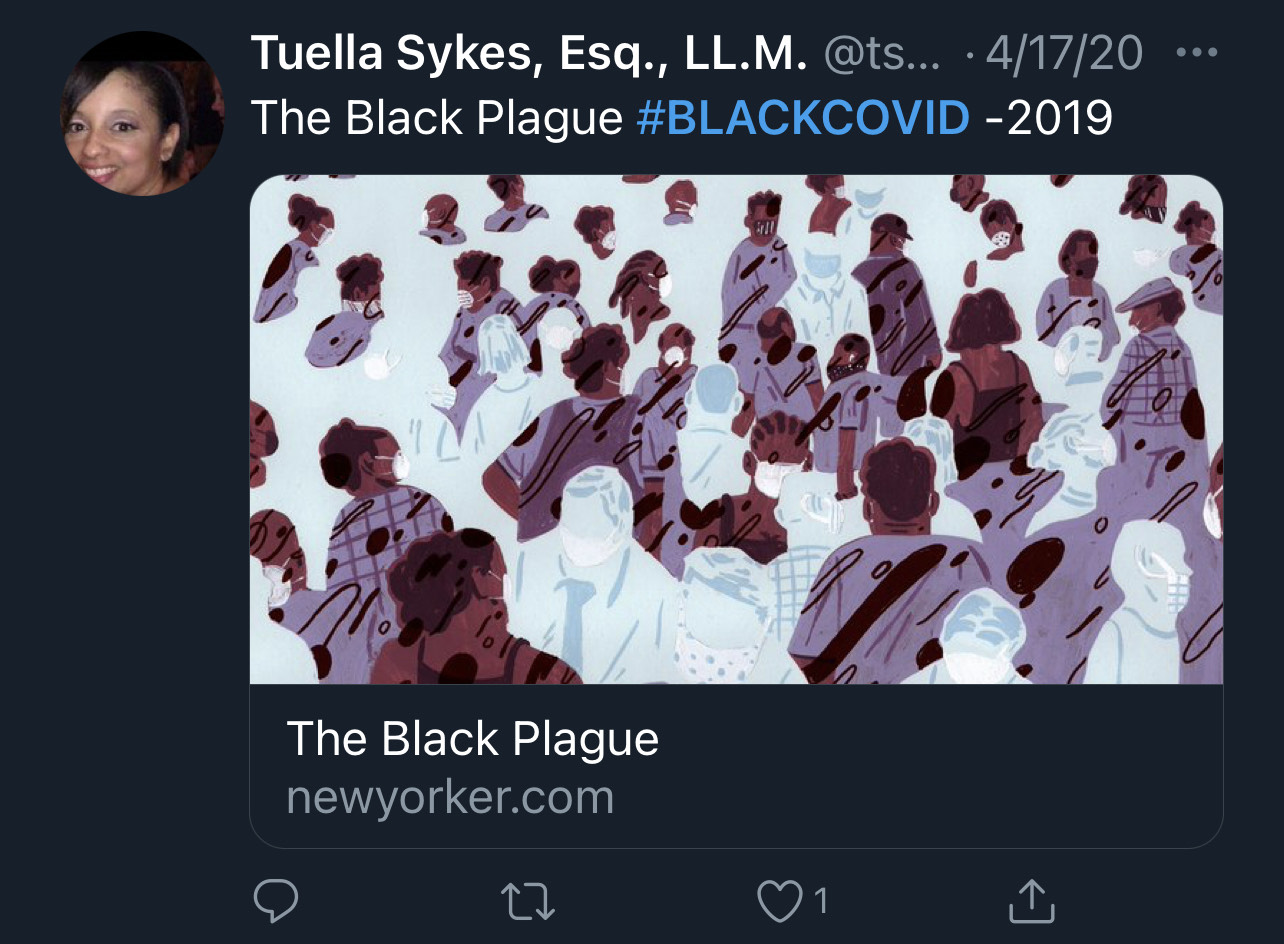 This post tags an article titled "The Black Plague" which states that according to the Reuters report African Americans are more likely to die from Covid-19 than any other group in the U.S.. The article goes further in to explain the synopsis of affected and deaths of certain states but it importantly states that black people are more likely to have pre-existing health conditions that weaken their immune systems causing them to be easily infected. Though this is one reason why; other reasons including, as stated in the article "Trumpanian Malfeseance" is another major cause. With the testing locations around the U.S having major breakpoints, it was noted that zipcodes of higher-income families had the closest and many available sights of getting tested compared to zip codes with low-income families. Further studies showed that out of these lower-income locations, the majority was filled by black people. This limited the opportunity for black people to get tested and explains how the pandemic is affecting black people.