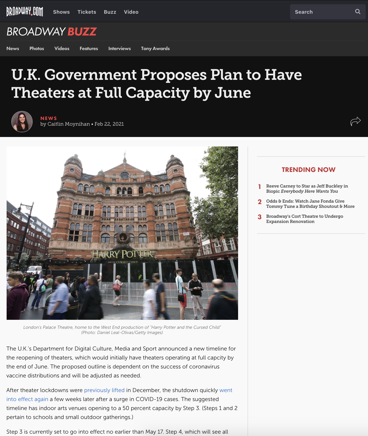This article discuses how theaters in the UK are already partially open and are expected to be at full capacity by June 2021. This is in contrast to Broadway, which is closed in any capacity until May. I feel like this shows how detrimental the United States' response to COVID-19 in 2020 was and how it set us behind the rest of the world in returning to normalcy.