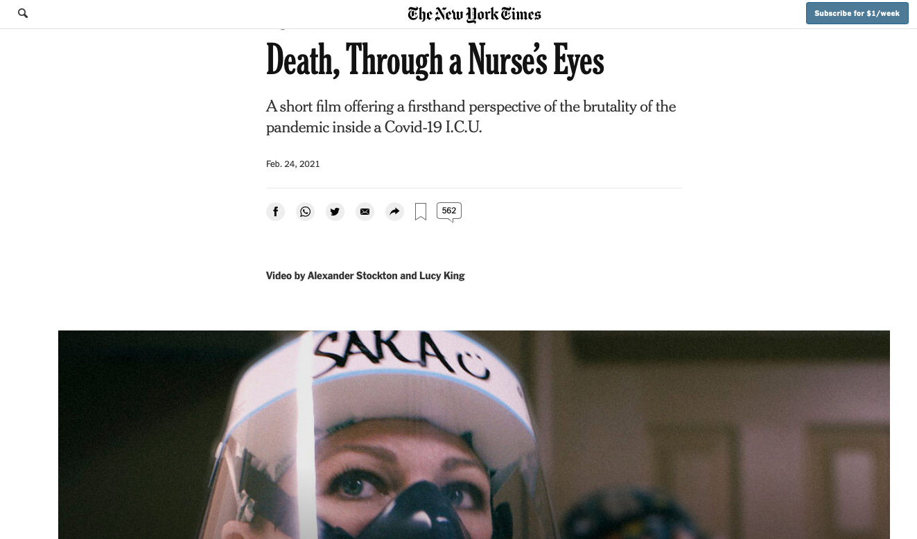 "A short film offering a firsthand perspective of the brutality of the pandemic inside a Covid-19 I.C.U." This reporter has nurses wear a camera so he can glimpse what happens in the Covid-19 units in an Arizona hospital.