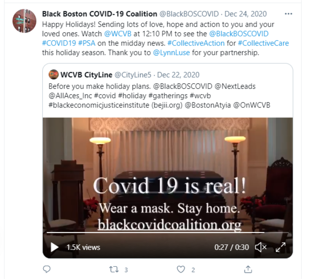 This twitter post by the Black Boston COVID-19 Coalition features a video warning Boston's Black community not to gather with their families during the holiday season. It was also shown on television as a PSA announcement on a local news station. The video shows a family celebrating Christmas dinner with their grandmother, a group of children receiving gifts from their uncle, and a dining room decorated with lots of party decorations. These happy scenes are interrupted by the grandma vanishing (to represent her death from COVID), a child critically ill with COVID in the hospital, and a coffin sitting alone in a funeral home. These stark images are meant to remained the Black community of their vulnerability COVID deaths and encourage them to avoid meeting their families in an attempt to stop their community from getting COVID-19. This twitter post shows the self-activism of Black community by showing how it mobilized to create COVID warnings and resources to help their people be informed and to warn them of the dangers of becoming a source and recipient of the virus.