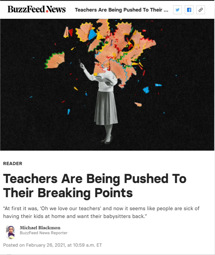 From article: “At first it was, ‘Oh we love our teachers’ and now it seems like people are sick of having their kids at home and want their babysitters back.”