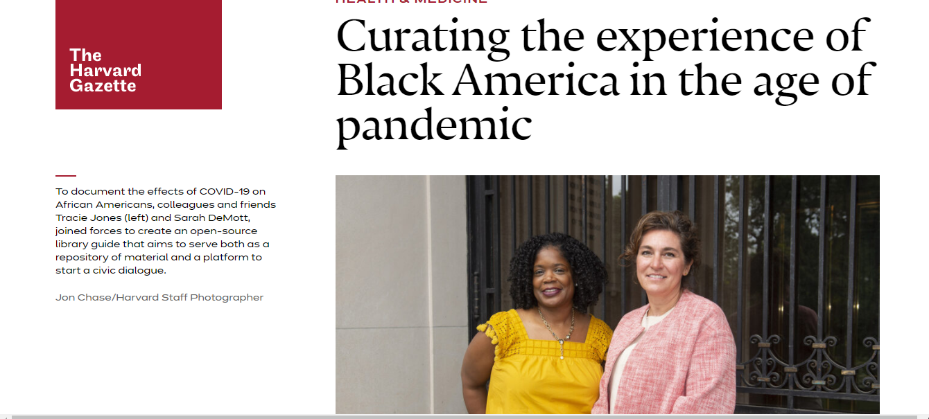 This story, from the Harvard Gazette, features the work of two friends -Tracie Jones & Sarah DeMott- as they try to curate the experiences of black Americans during the coronavirus pandemic. Their collective effort resulted in Black America and COVID-19; a library guide that seeks to serve as a historical database for stories about the impact of the pandemic on African American communities. Information and material included in the database ranges from oral histories, podcasts, blogs, and links to webinars.