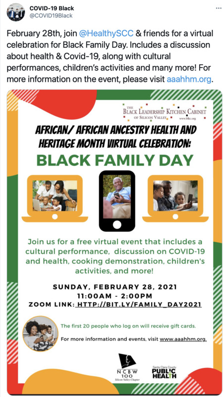 Repost via Twitter @COVID19Black. Santa Clara County Public Health is hosting a virtual celebration for Black Family Day on Sunday, February 28, 2021 (11:00 AM- 2:00 PM) zoom link provided: http://BIT.LY/FAMILY_DAY2021