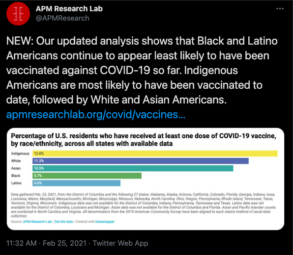 As is common with many other facets of BIPOC receiving access to healthcare in westernized countries black people are falling behind their white counterparts in receiving the vaccine. Only 5.7% of black U.S. citizens have received the vaccine as compared to 11.3% of white U.S. citizens. The disparities reflect a general inability for black people to receive adequate care in the United States while white people are generally able to receive a higher level and more care. Vaccines are especially important with regard to COVID as it represents a path back to normal life. Black people are receiving the vaccine at a rate almost half of that of the next racial group.