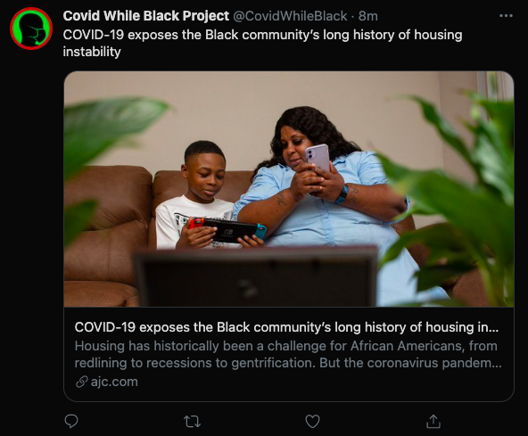 This article discusses the way that housing instability has begun to disproportionately affect black people during COVID. Black people typically face a myriad of intersectional issues that come from a lack of resources or economic support. As people were being laid off at the start of COVID black people of course were disproportionately more affected which in turn can be seen in a lack of stable housing. This in turn serves to make black people more susceptible to catching and being more affected by the conditions created by the pandemic. Housing is an important issue that leads to other things like health and safety. This leads to cyclical poverty which is only made worse by racial positionality and the pandemic.