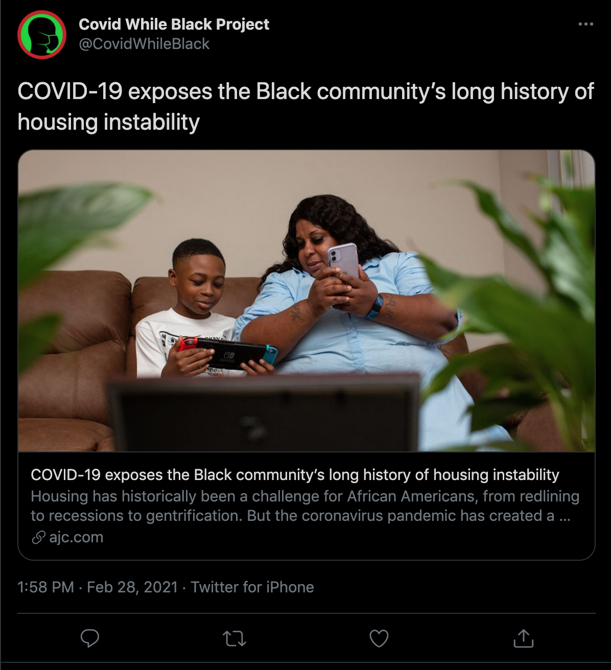 The twitter page CovidWhileBlack shared a story, which I have linked, titled "COVID-19 Exposes the Black Community's Long History of Housing Instability." The struggle to keep a roof over one's head had been even more difficult through this pandemic, but even more so for many Black people. This article describes the shocking statistics of the inequalities. With many people losing their jobs, and with only 47% of the Black US population owning their own homes, the pandemic had caused many Black Americans to face evictions. These are sad statistics showing the state of inequality against Black citizens, especially during this pandemic. Real change needs to be made.