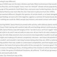 Please share your thoughts about how you view our post-pandemic world. What will you do the first day you can meet your friends? Where will you go when you can travel? What will be different? Using the Journal of The Plague Year’s “Share Your Story” page, post a written text, an image, a video, or an oral history. Use our tag #SMhopes to ensure you’re included in Santa Monica’s Archive of Hopes and Dreams, our time capsule of this crazy time.