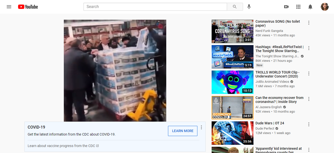 A video meme making fun of the panic buying of toilet paper in march of 2020. Appears to be a Costco. Dubbed with zombie noises from The Walking Dead. I feel its important for videos of these events to be preserved as well as the social/ popular response to events like panic buying