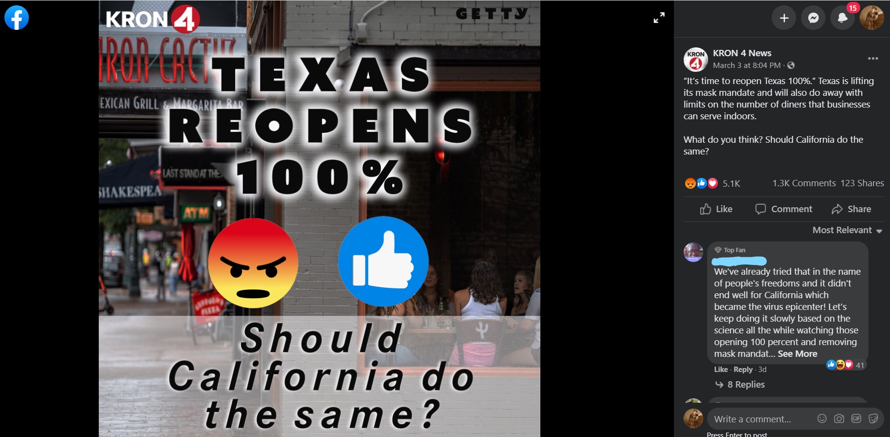 From Kron4 News: “It’s time to reopen Texas 100%.” Texas is lifting its mask mandate and will also do away with limits on the number of diners that businesses can serve indoors.