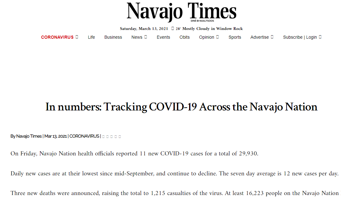 This article reports the latest Navajo Nation pandemic statistics including the number of new cases per day and percent of Indigenous Peoples who have received the COVID-19 vaccinations.