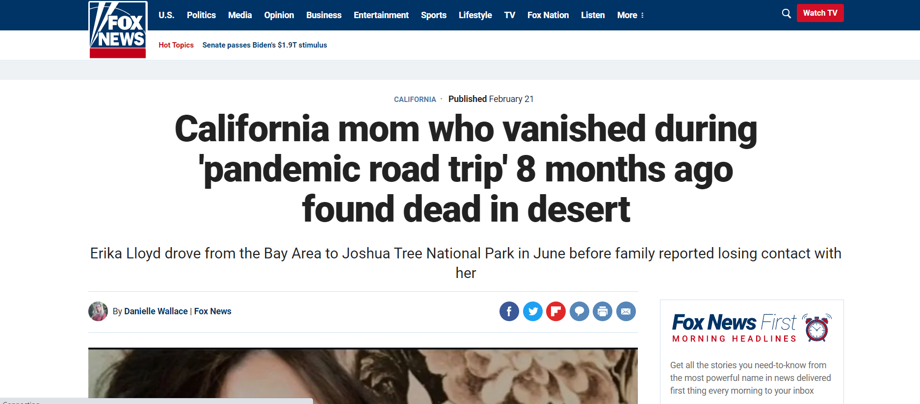 It broke my heart to hear that she was found dead. Single mom from San Francisco who just wanted to get out for an adventure on a "pandemic" road trip, went missing several months ago.