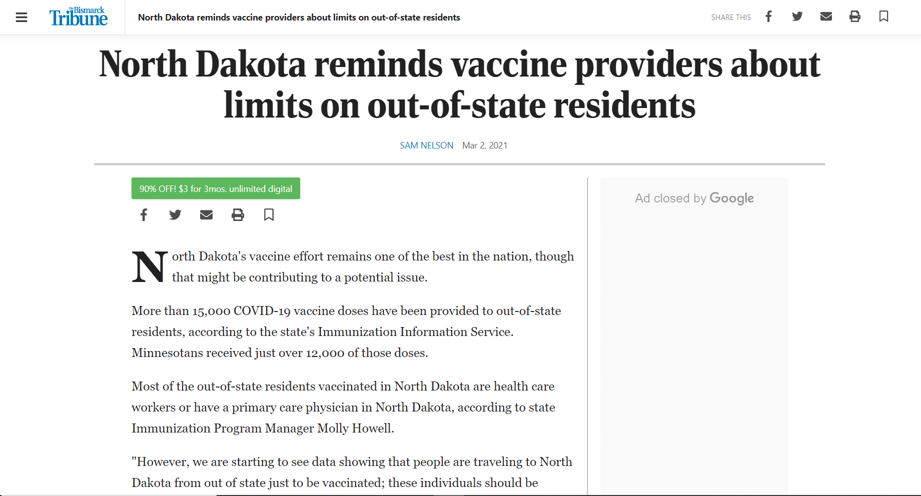 As North Dakota continues COVID-19 vaccinations, it has been revealed that many doses have gone to out-of-state residents. Although the state isn't fully against this, they do have exceptions for some out-of-state residents that enables them to receive a COVID-19 vaccine in North Dakota. These exceptions are healthcare workers from out-of-state and patients of healthcare providers in North Dakota. There are a few other exceptions as well.