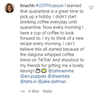 #JOTPYLesson I learned that quarantine is a great time to pick up a hobby. I didn’t start drinking coffee everyday until quarantine. Now every morning I have a cup of coffee to look forward to. I try to think of a new recipe every morning. I can’t believe this all started because of the dalgona whipped coffee trend on TikTok! And shoutout to my friends for gifting me a lovely Keurig!!☕️🍵 @zafinasinha @avi.puppala @shaantala @tahs.in @jake.dallman