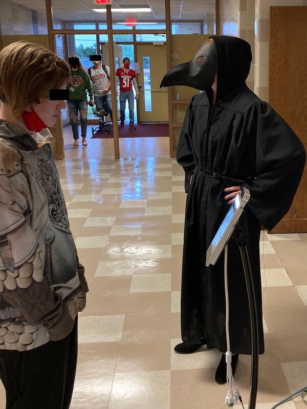 As a history teacher in rural Kansas, I thought I would bring a little humor to my hallway as I monitored the temperature scanners. My world history students were currently studying the Middle Ages and in our small school, I had taught every single sophomore, junior, and senior the same lessons, so I knew they would understand my outfit and think it was funny. This was a nice way to bring humor to a new situation during the first few weeks of an uncertain school year.