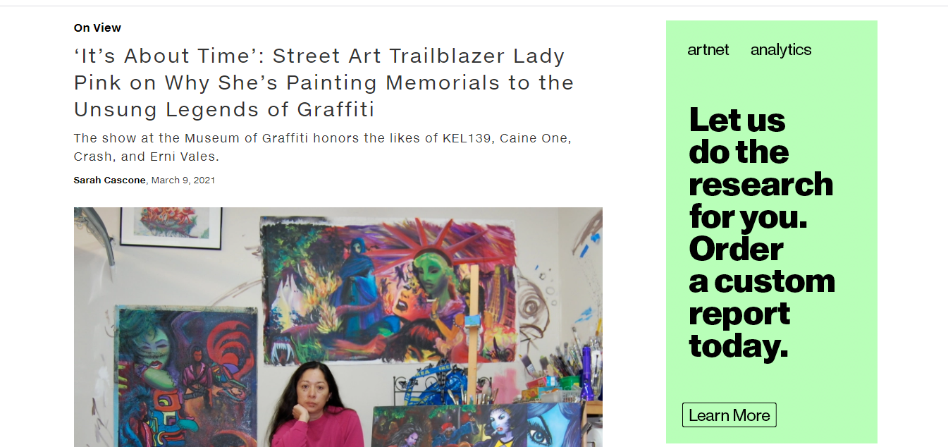 This story talks about famous graffiti artist, Lady Pink, and her upcoming solo show at the Museum of Graffiti in Miami, Florida. Lady Pink mentions getting the vaccine as part of travel plans and virtually attending her show opening, and the transition of graffiti art to gallery space and the corresponding taboo.