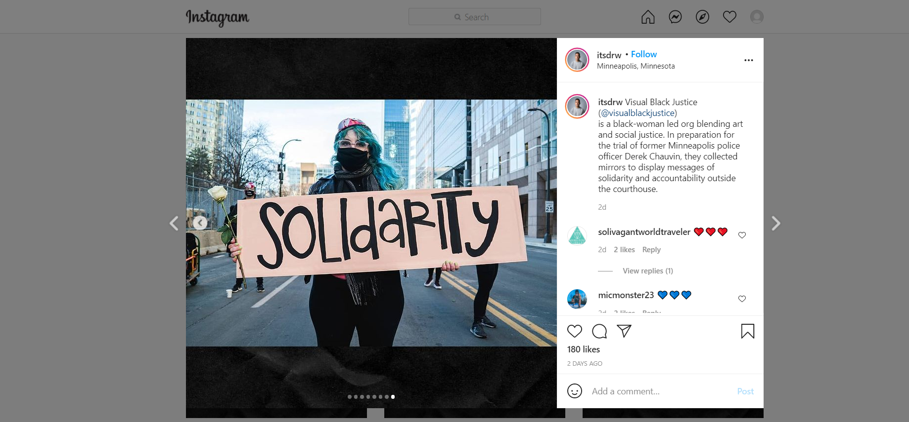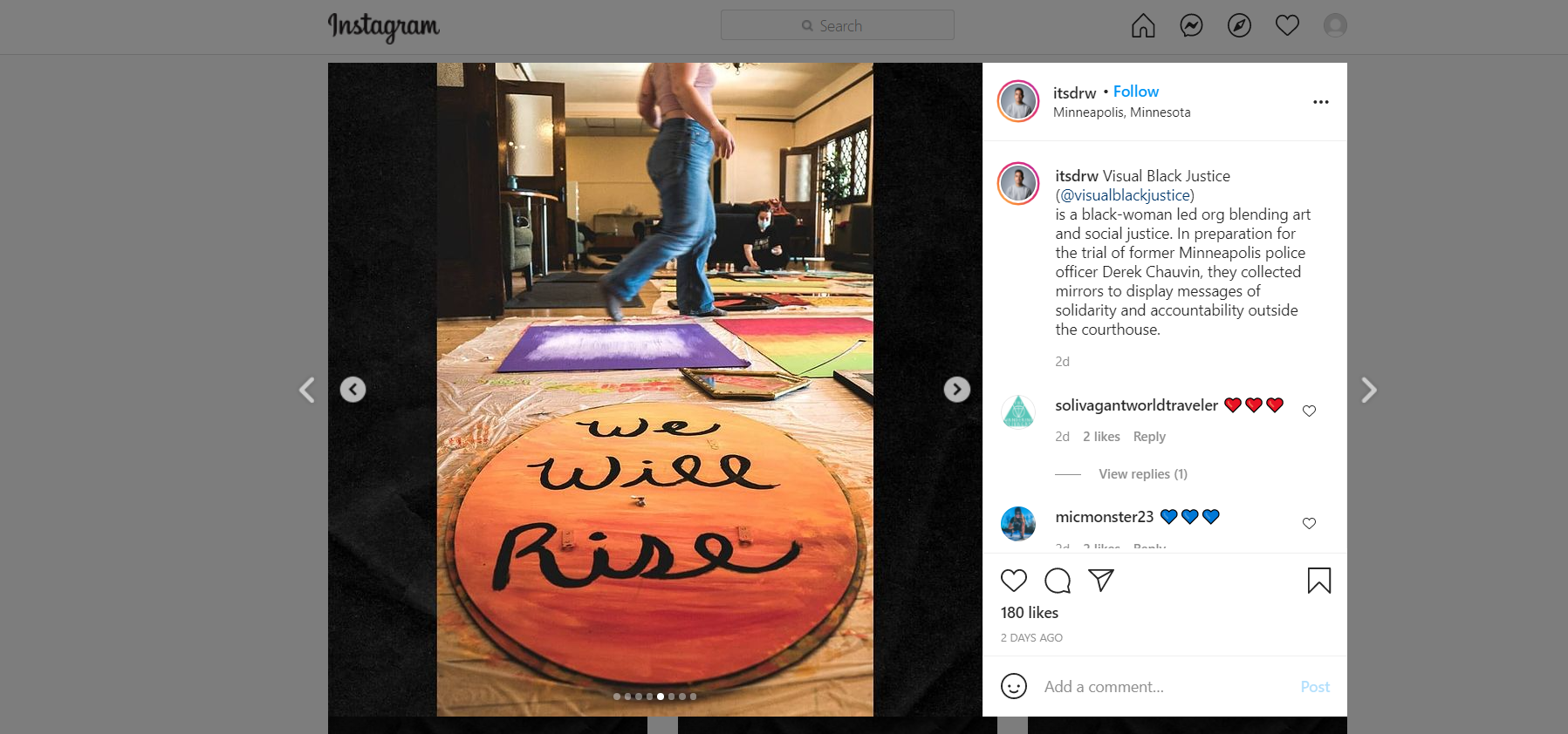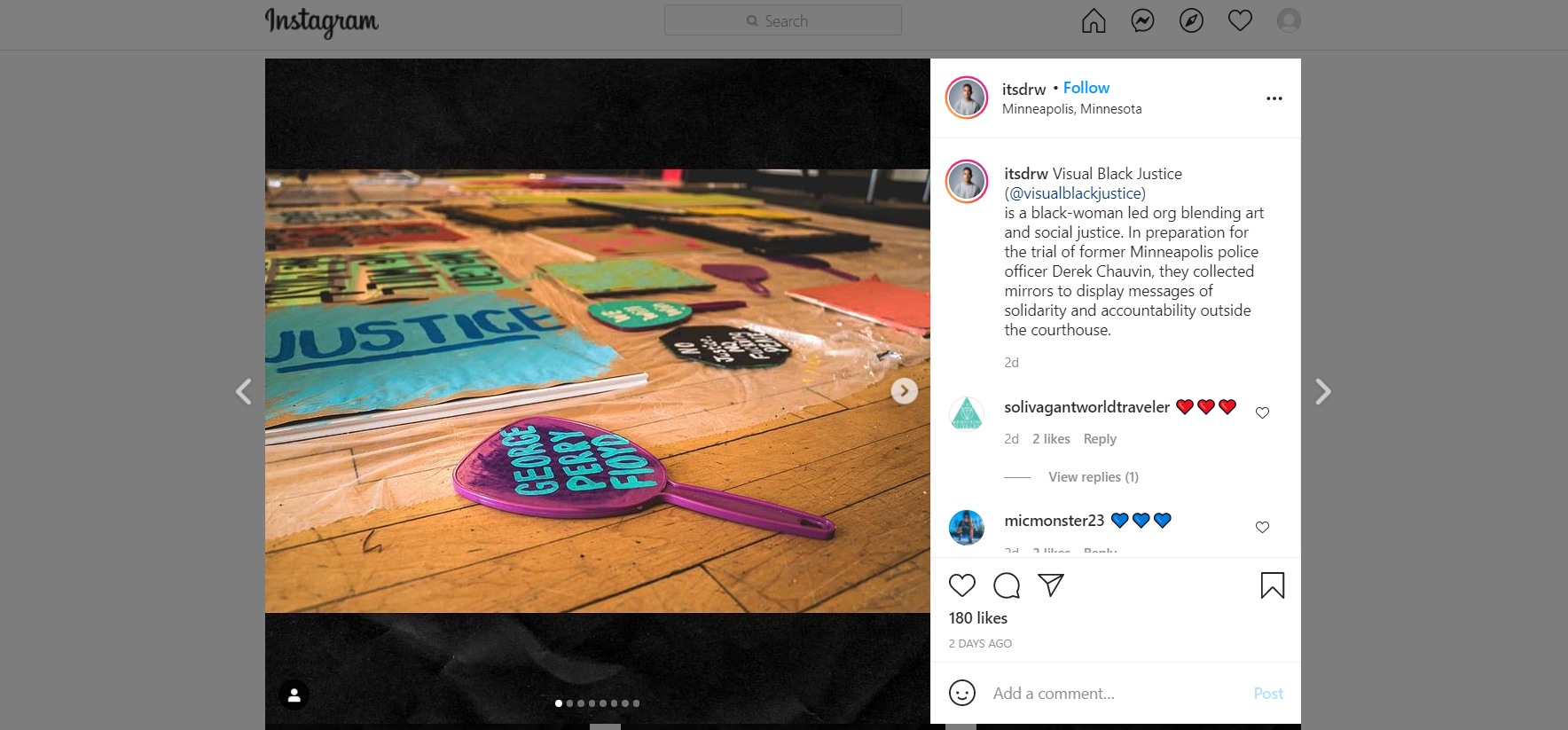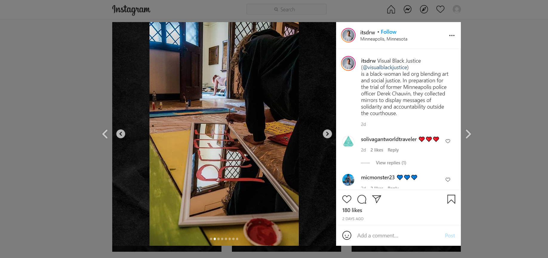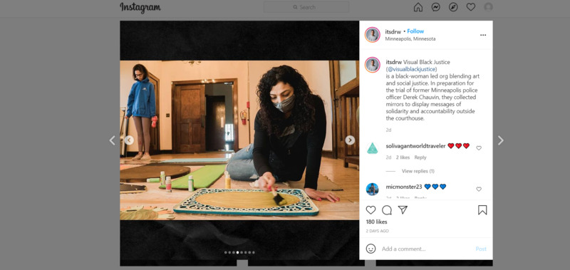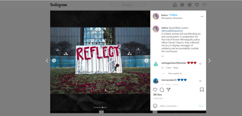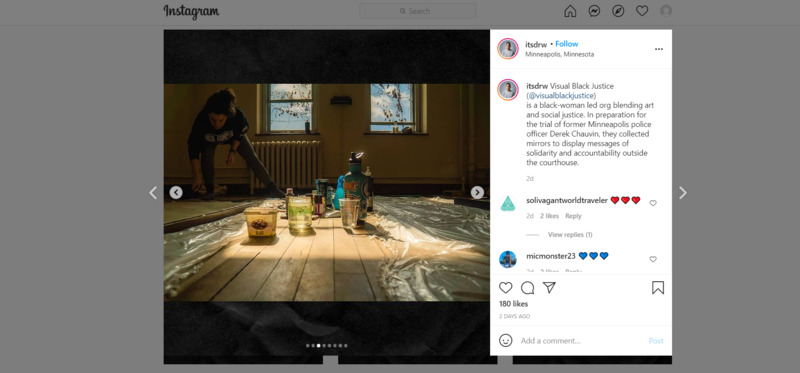 is a black-woman led org blending art and social justice. In preparation for the trial of former Minneapolis police officer Derek Chauvin, they collected mirrors to display messages of solidarity and accountability outside the courthouse.