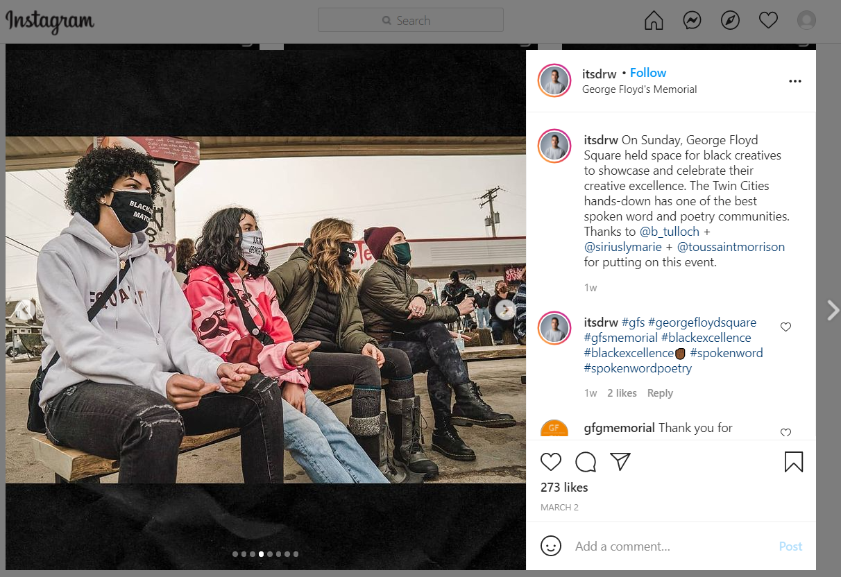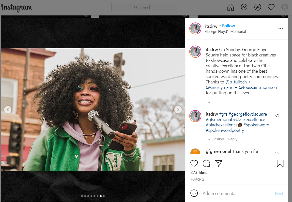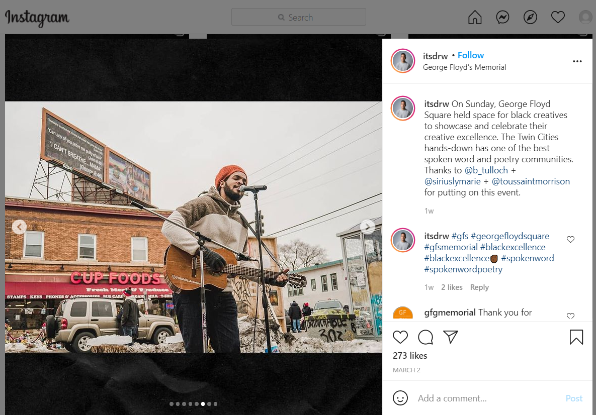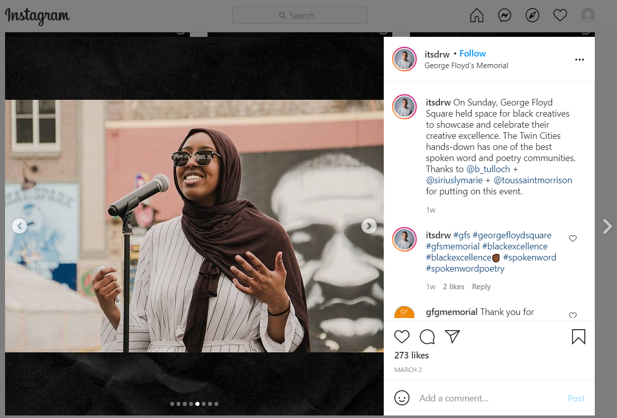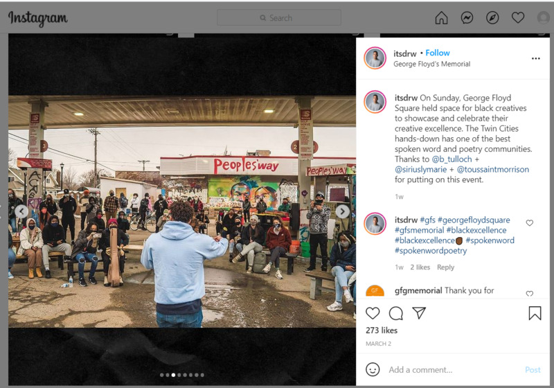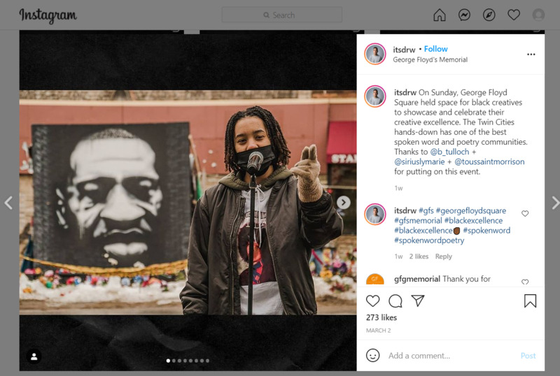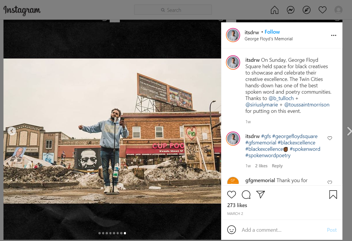 From Drew Arrieta's post: On Sunday, George Floyd Square held space for black creatives to showcase and celebrate their creative excellence. The Twin Cities hands-down has one of the best spoken word and poetry communities. Thanks to @b_tulloch + @siriuslymarie + @toussaintmorrison for putting on this event.