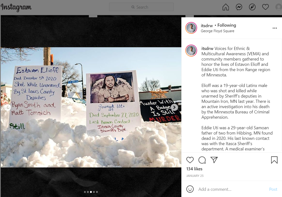 Elioff was a 19-year-old Latinx male who was shot and killed while unarmed by Sheriff's deputies in Mountain Iron, MN last year. There is an active investigation into his death by the Minnesota Bureau of Criminal Apprehension.